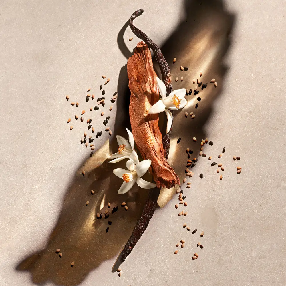 Les notes de tête dorées de sésame noir et blanc ouvrent le parfum, laissant place en notes de cœur à un accord lumineux de fleur d’oranger. En fond, des notes de vanille torréfiée se mêlent au bois de santal crémeux pour un sillage envoûtant.